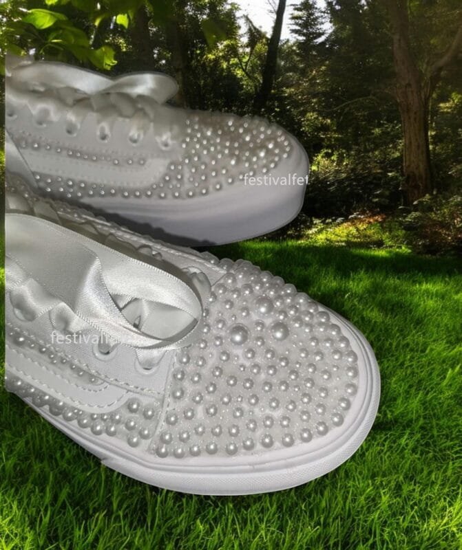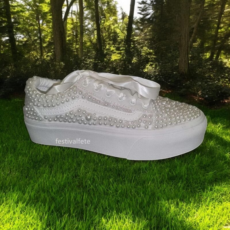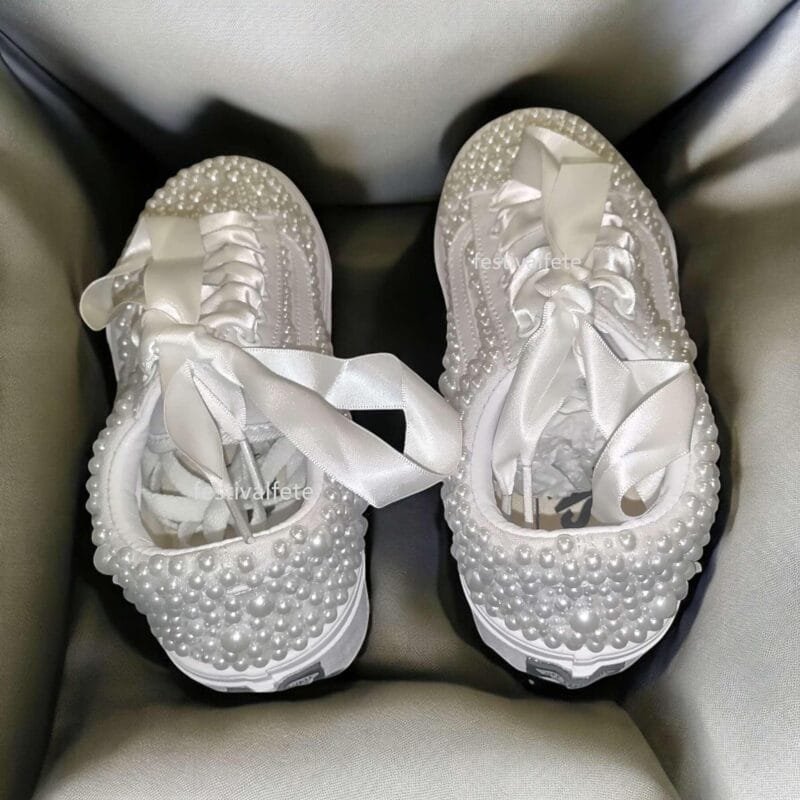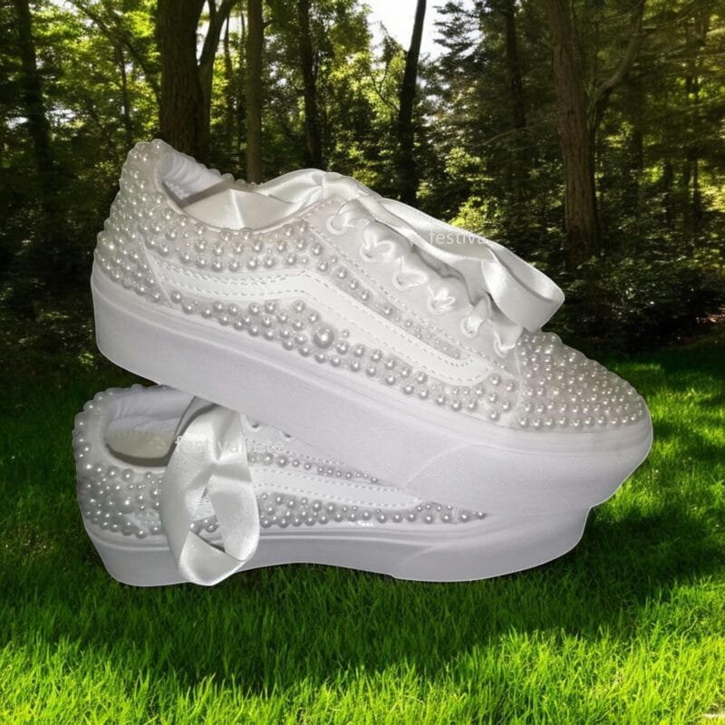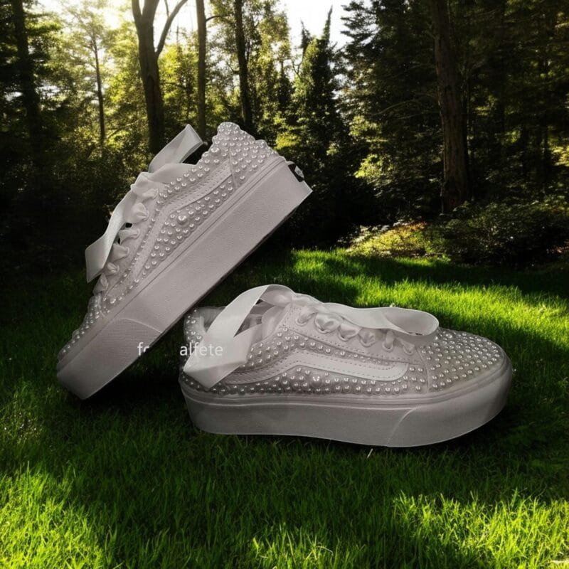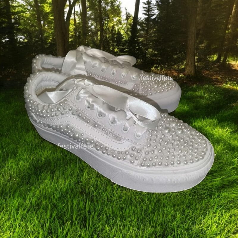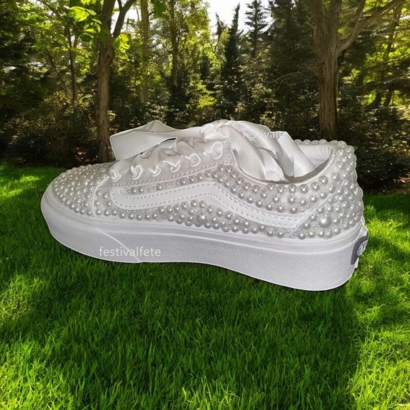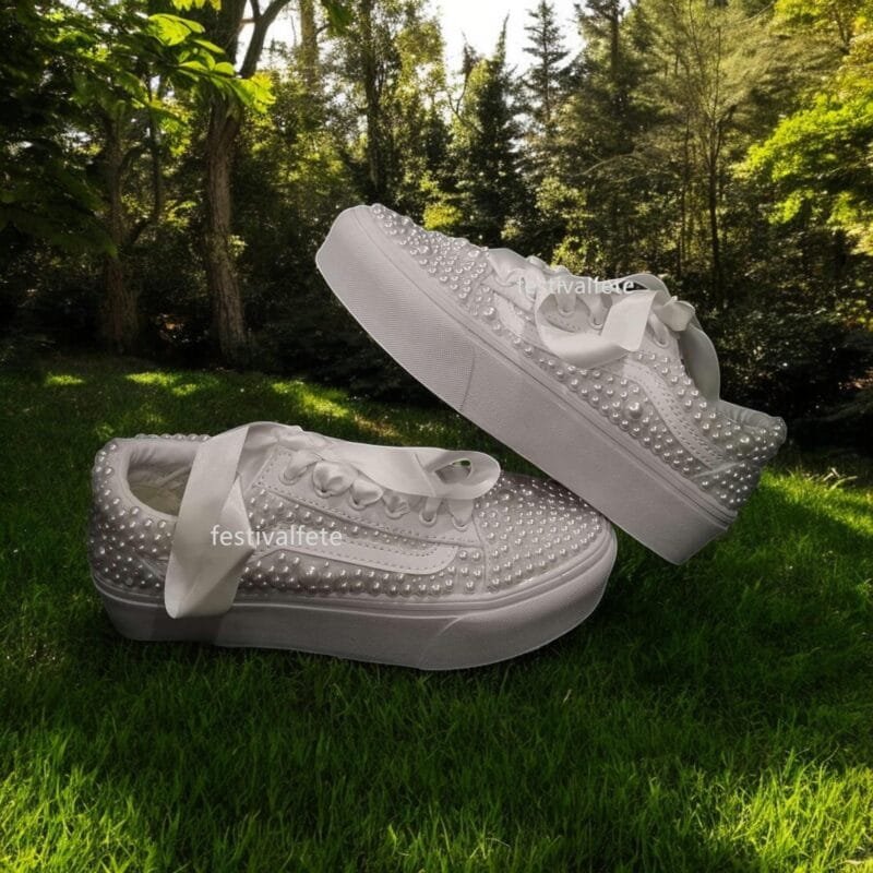 Unforgettable Elegance: Make a statement on your special day with these stunning custom Slip-on Skate Sneakers, adorned with delicate pearls. They add a touch of timeless elegance to your bridal look, perfect for a modern and unforgettable wedding.